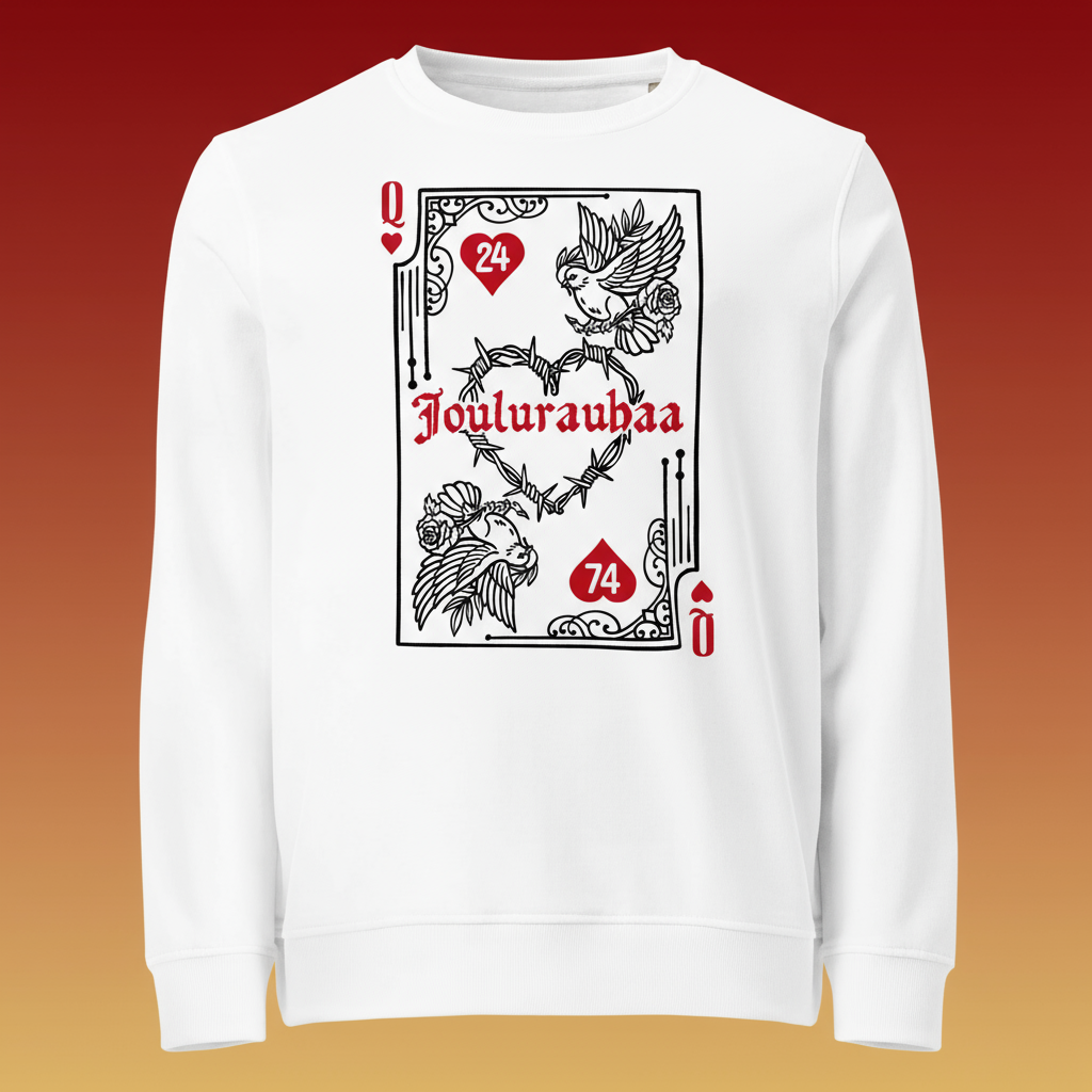 Vuoden lähestyessä loppuaan ja joulun lähestyessä haluamme omalta osaltamme toivoa ja toivottaa rauhaa maailmaan. Joulurauhaa-collegepaidassa vapautamme rauhankyyhkyt, jotka muuttavat piikkilangatkin sydämiksi. Nyt on jokaisen oman elämänsä kuningattaren ja kunkun eli joka naisen ja miehen aika julistaa joulurauhaa.