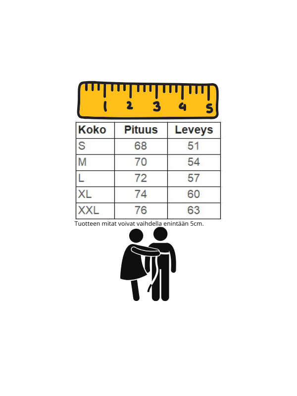 Nyt hihat heilumaan ja mitta käteen. Jos ostat tuotteen lahjaksi, yritä saada mitat lahjan saajan lempipaidasta. Tuote on unisex-malli, joka sopii sekä naisille että miehille.