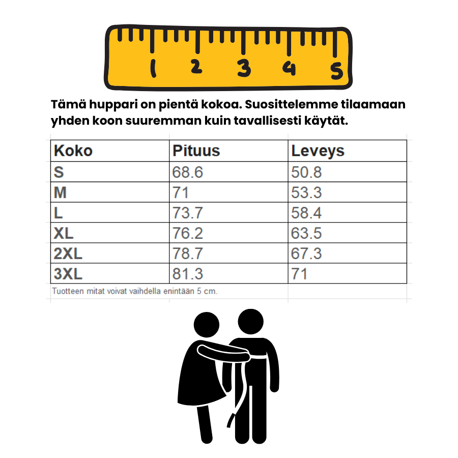 Tämä huppari on pientä kokoa. Suosittelemme tilaamaan yhden koon suuremman kuin tavallisesti käytät.