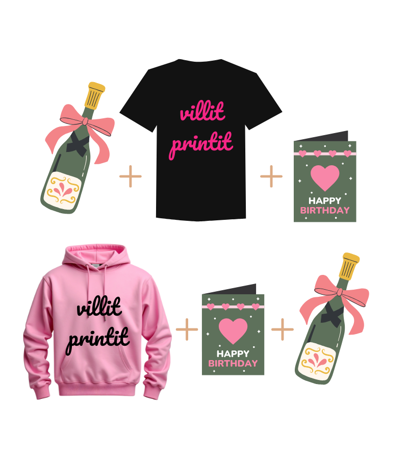 Vaikka tämä lahjakassi toimii myös sellaisenaan, se on parhaimmillaan täytettynä. Täytteeksi voit ostaa vaikkapa kukkia ja kuohuvaa, ja meiltä löydät persoonalliset 50-vuotislahjat lahjakassiin laitettavaksi.